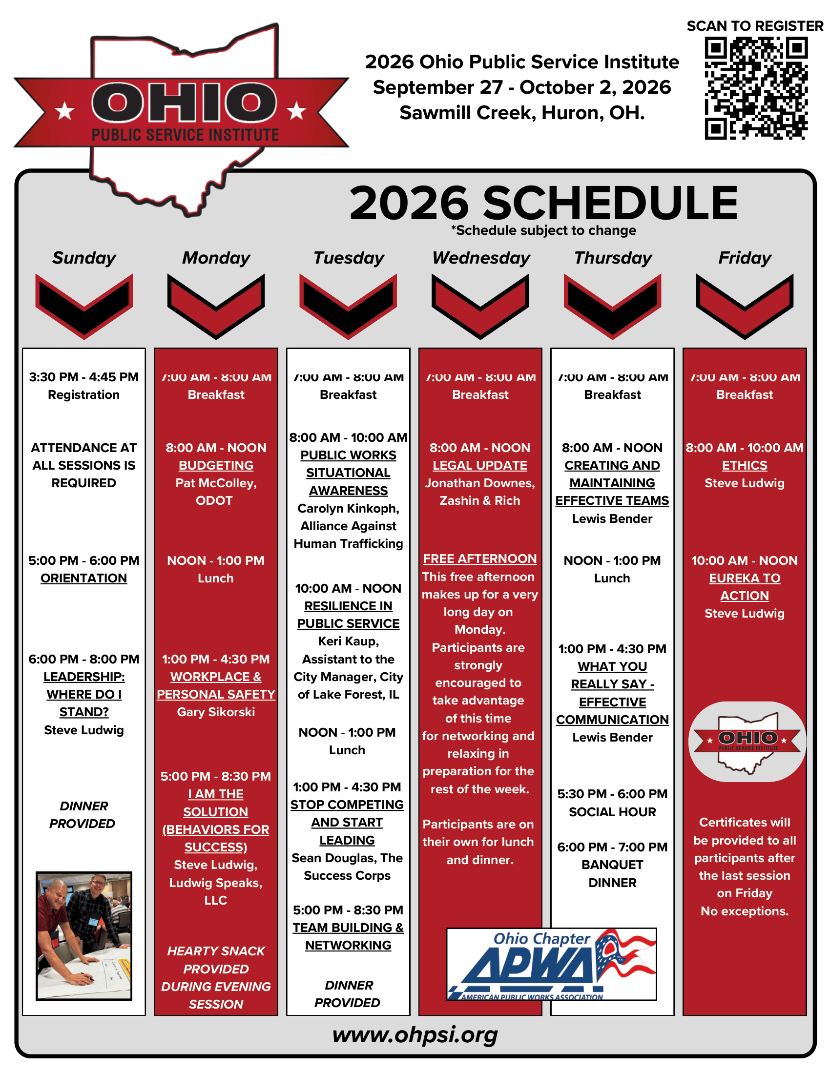 OHPSI is a three-year training program which provides instruction expressly designed for city and county public service supervisors, managers and directors. This program is divided into three one-week sessions focusing on Leadership Development, Service Excellence and Personal Supervisory Skills. These sessions are non-sequential and one may begin the three-year cycle at any time. This program is held each Fall at the Sawmill Creek by Cedar Point Resorts in Huron, Ohio.